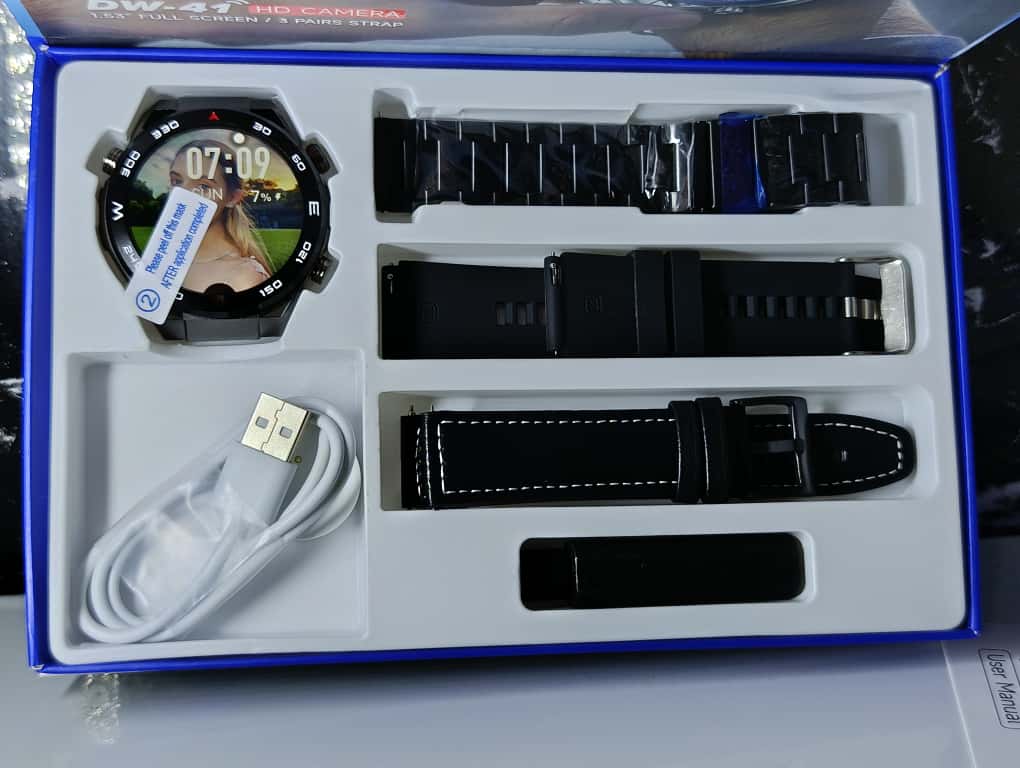 در جعبه محصول سه بند مختلف شامل رولکسی، چرمی و سیلیکونی به همراه ابزار تنظیم بند رولکسی ارائه شده است. اتصال هر یک از این بندها به ساعت هوشمند DW-41 ظاهر زیبا و منحصر به فردی به آن میبخشد و تجربهای جذاب و متفاوت برای کاربر فراهم میکند.